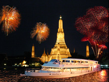 - ITINERARY: Each deck has its unique qualities and design. Your dinner includes a wide selection of dishes ranging from Thai-styled to international foods, appetizers to main dishes to deserts served in a buffet fashion. While enjoying your dinner, our saxophonists and singers will soothe you with soft Pop and Jazz songs in the first hour of your journey. You will have the opportunity to take snapshots of the scenery, famous historical structures and religious monasteries such as the Royal Grand Palace Wat Pra Kaew, Wat Arun (The Temple of the Dawn), Bangkhunprom Palace, Kanlayanamitr Temple and the Rama 8 Bridge along both sides of the river bank. After your dinner, join our talented musicians with an entire hour of upbeat groovy songs for dancing.