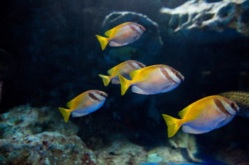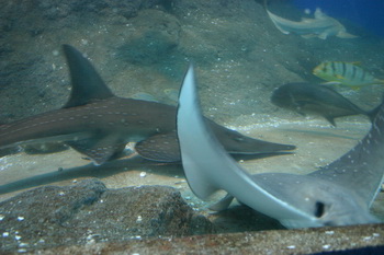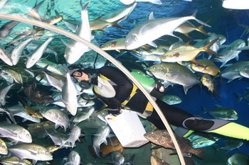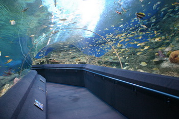 From here, they start their descent, passing brightly colored corals and all kinds of exotic ocean-dwellers along the way. Finally they come to a spectacular 100 meter-long tunnel with acrylic windows, home to great shoals of fish, prowling predators and a host of other creatures that inhabit the ocean depths.