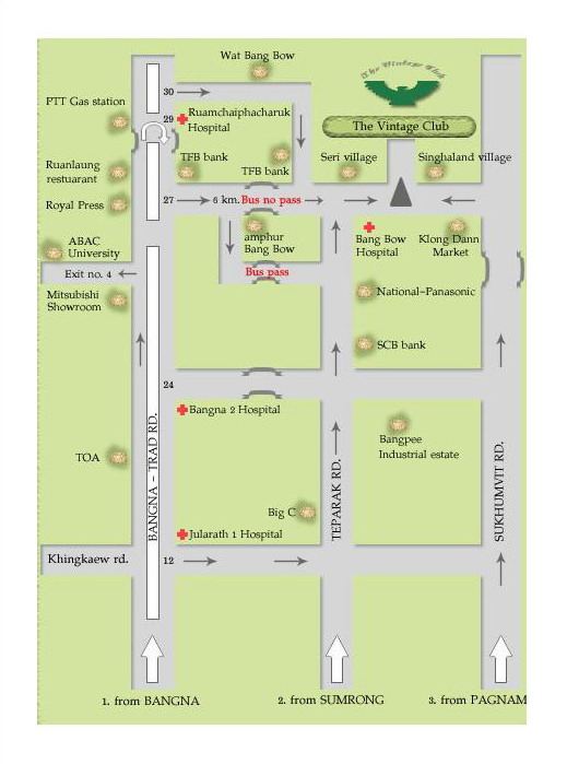 - The Vintage Club, an 18 hole course, developed by the Central group is located 10 minutes drive from the 28 km point of the Bangna-Trad Highway. If driving from Bangkok centre, be aware of the required U-turn which appears with little warning, (if on the elevated tollway use exit 4). The course itself is extremely well maintained, most holes feature well placed bunkers and water hazards. Clubhouse facilities are excellent and include a swimming pool, fitness centre and a restaurant offering an array of different cuisines.
