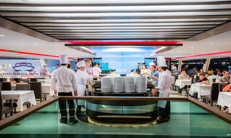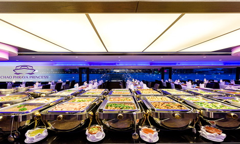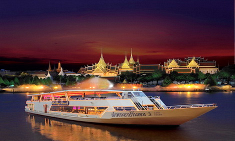 - ITINERARY: Each deck has its unique qualities and design. Your dinner includes a wide selection of dishes ranging from Thai-styled to international foods, appetizers to main dishes to deserts served in a buffet fashion. While enjoying your dinner, our saxophonists and singers will soothe you with soft Pop and Jazz songs in the first hour of your journey. You will have the opportunity to take snapshots of the scenery, famous historical structures and religious monasteries such as the Royal Grand Palace Wat Pra Kaew, Wat Arun (The Temple of the Dawn), Bangkhunprom Palace, Kanlayanamitr Temple and the Rama 8 Bridge along both sides of the river bank. After your dinner, join our talented musicians with an entire hour of upbeat groovy songs for dancing.