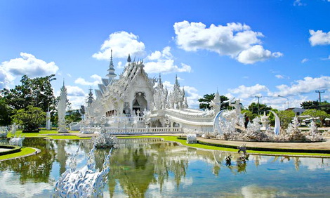 Departure to Rong Khun Temple. Explore the stunning architecture, white building adorned with glass. A mixed Buddhish - Hindu temple that definitely decorated with luminous white glass and stucco Thai sculptures of the legendary animals of Sumeru Mountain. It was designed and constructed by Prof. Chalermchai Kositpipat, a national artist in the field of painting.